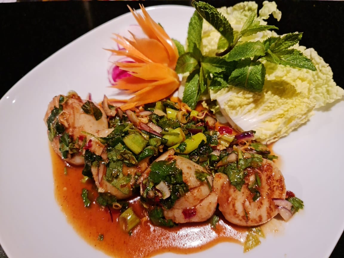 Nouilles de riz sautées aux scampis, œufs, cacahuètes, légumes et jus de tamarin.